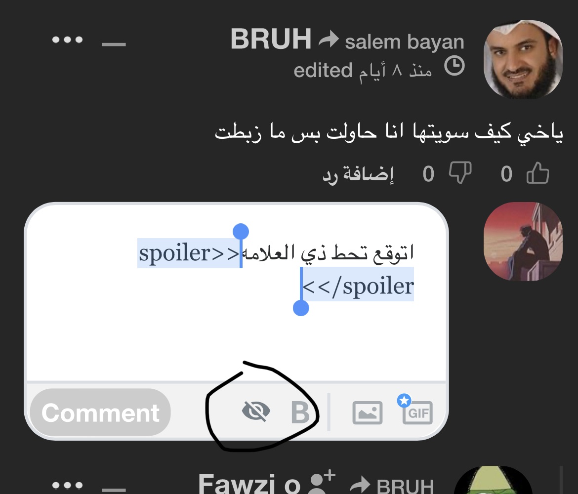 ياخي مدري ليه ما ترد علي في نفس التعليق بعدين لما تقول واحد حاط صورة شيخ معروف باخلاقه و دينه و في نفس الوقت ذاك الي حاط صورته يتابع بيرسيرك الي فيه كفر و تفصخ في رمضان انت حرفيا تقول عني منافقة بدون ما تقولها لكن واضحة بعدين انت تحسبنا انولدنا امس ترا واضحة انك تقصدني بكلامك سواءا انا او ماي سيستر مرام اسر لاننا احنا بس الي حاطين صورة مشاري العفاسي